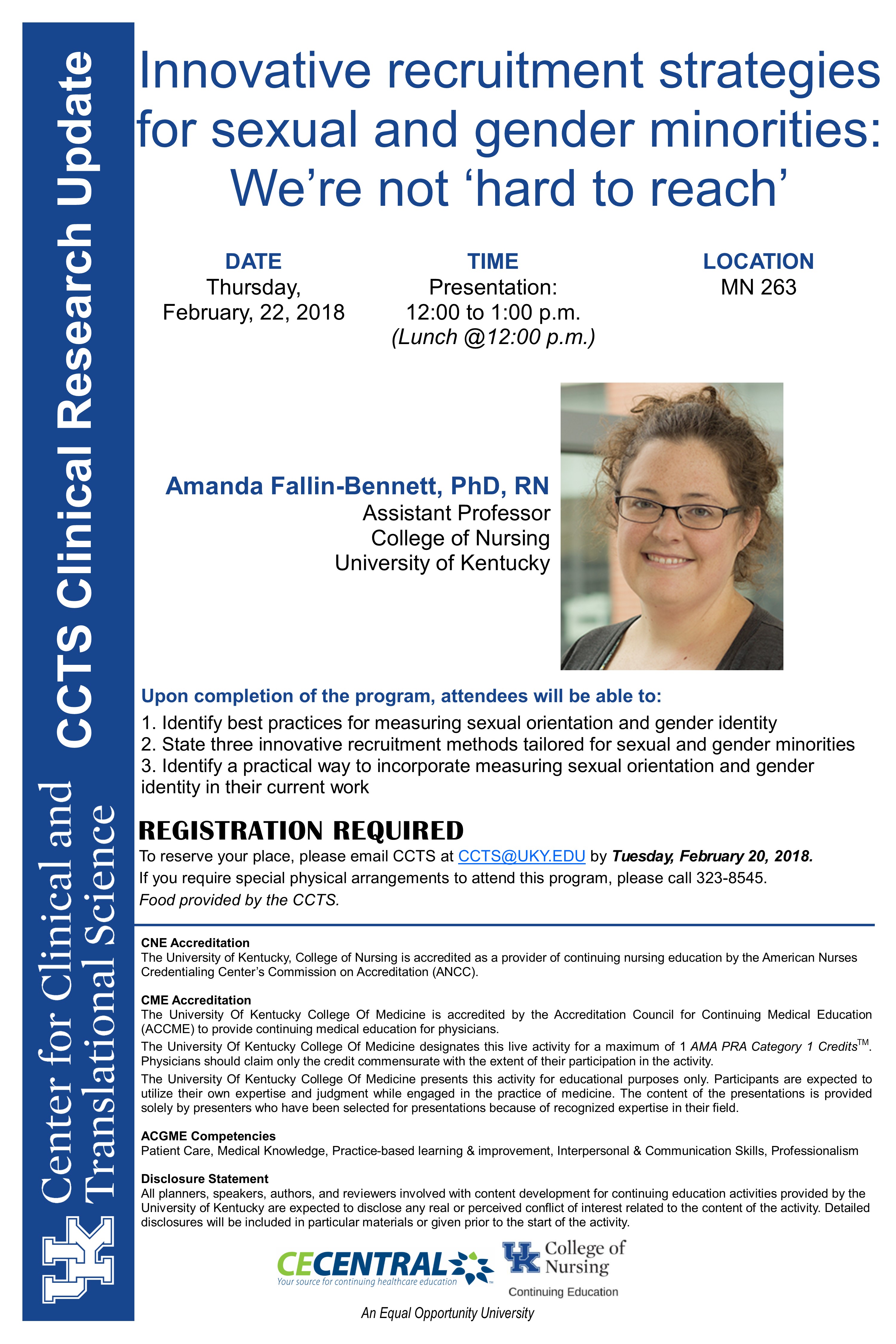 Clinical recruitment strategies for sexual and gender minorities: We're not 'hard to reach' To attend, RSVP to ccts@uky.edu by Tuesday, February 20, 2018.